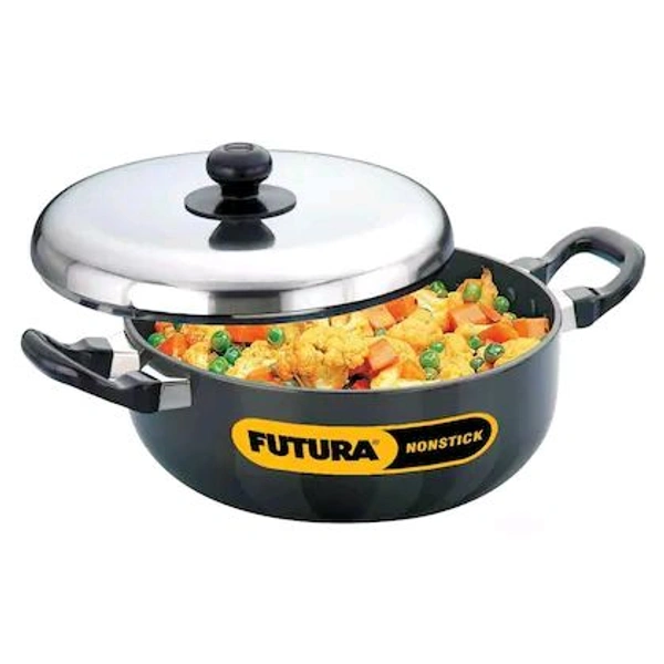 Hawkins Futura Black Hard Anodised Non Stick Frying Pan With Stainless Steel Lid 3 L can be used for stir-frying and deep frying in addition to their use as frying pan. This frying pan comes with rounded sides and extra height, which prevent spilling of food while stirring. This product comes with a non-stick coating which helps you in residue free cooking. The heavy base of this pan helps with quick and even heating and is more stable while cooking. Ideally used for cooking fish, matar paneer, gravies and many more. So what are you waiting for? Buy this product online today!