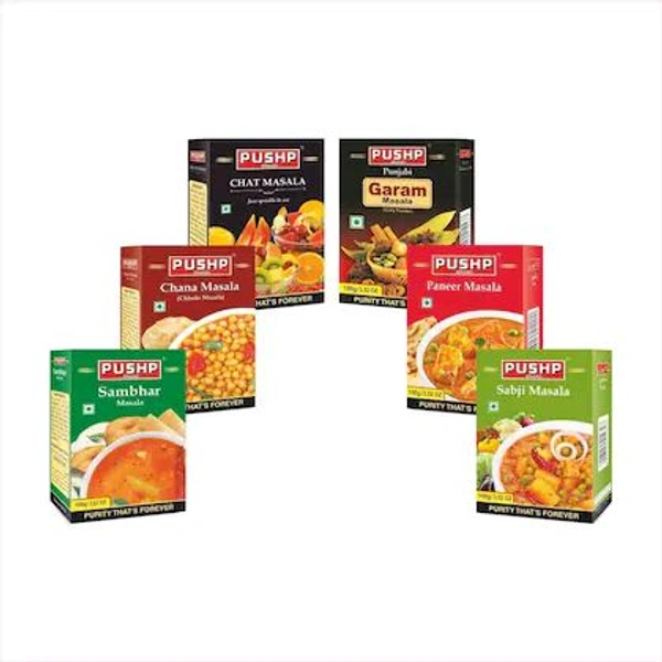 Pushp Brand Combo Pack 100g Each (Punjabi Garam Masala, Chana Masala, Chat Masala, Sambhar Masala, Paneer Masala, Sabji Masala) - Combo Spices Pack
